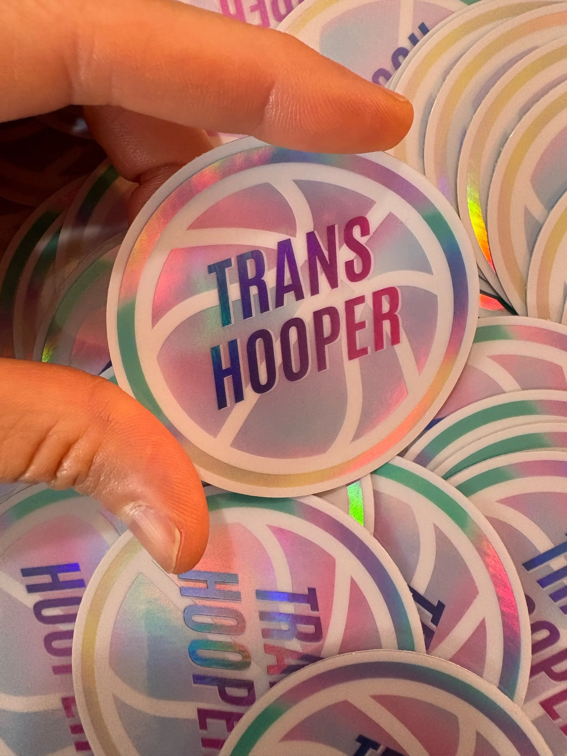 A 2.5” round holographic sticker for every trans person who plays, watches, and loves the game. Trans Hooper features a white outlined basketball filled with the gradient colors of the trans flag (pink, blue and white) with bold text that says exactly what it means.